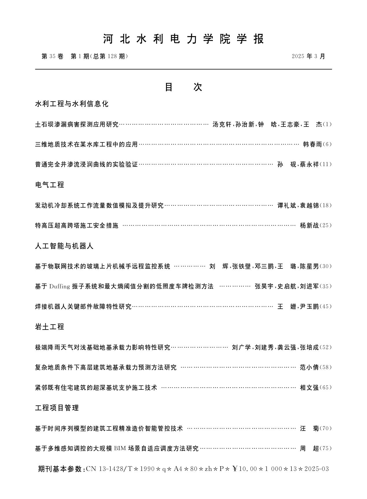 《河北水利电力学院学报》2025年第1期正式出版,本期共包含水利工程与水利信息化、电气工程、人工智能与机器人、岩土工程、工程项目管理5个专题,刊登文章13篇,相关电子资源可到本站主页下载。
