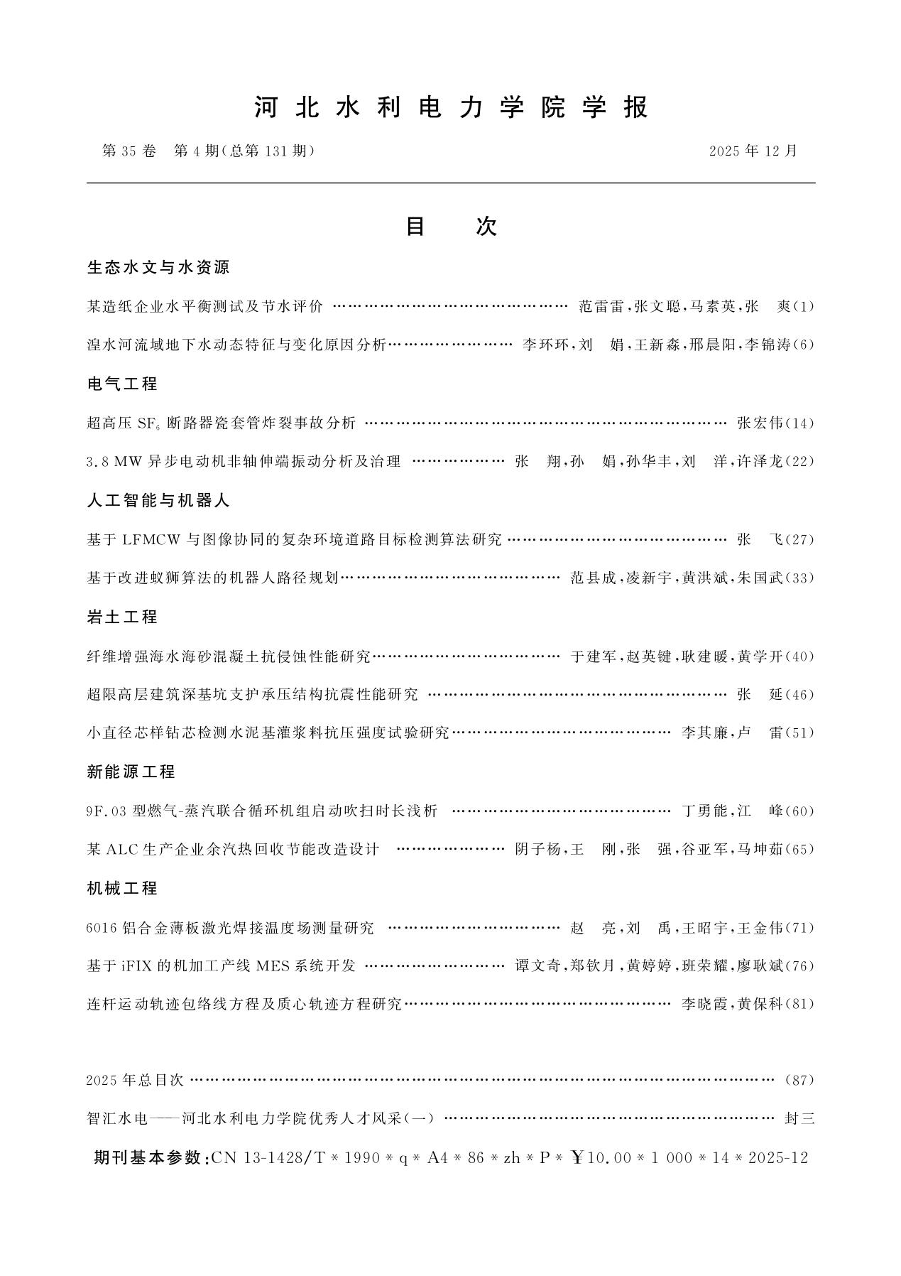 《河北水利电力学院学报》2025年第4期正式出版,本期共包含生态水文与水资源、电气工程、人工智能与机器人、岩土工程、新能源工程、机械工程6个专题,刊登文章14篇,相关电子资源可到本站主页下载。封四特别刊登“智汇水电——河北水利电力学院优秀人才风采(一)”,集中展示我校优秀人才在服务水利电力行业和地方经济社会发展中的突出贡献与精神风貌。